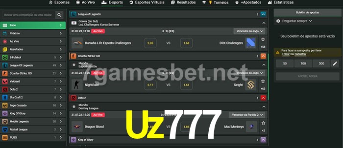 O Uz777 oferece uma grande seleção de opções de apostas em e-sports com probabilidades competitivas